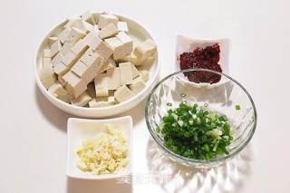 准备食材。卤水豆腐一块、猪肉馅适量。辣椒面10克、花椒10克、蒜10克、香葱适量、郫县豆瓣酱适量、食用油适量、酱油少许、水淀粉30克、鸡精1克、香油几滴。
