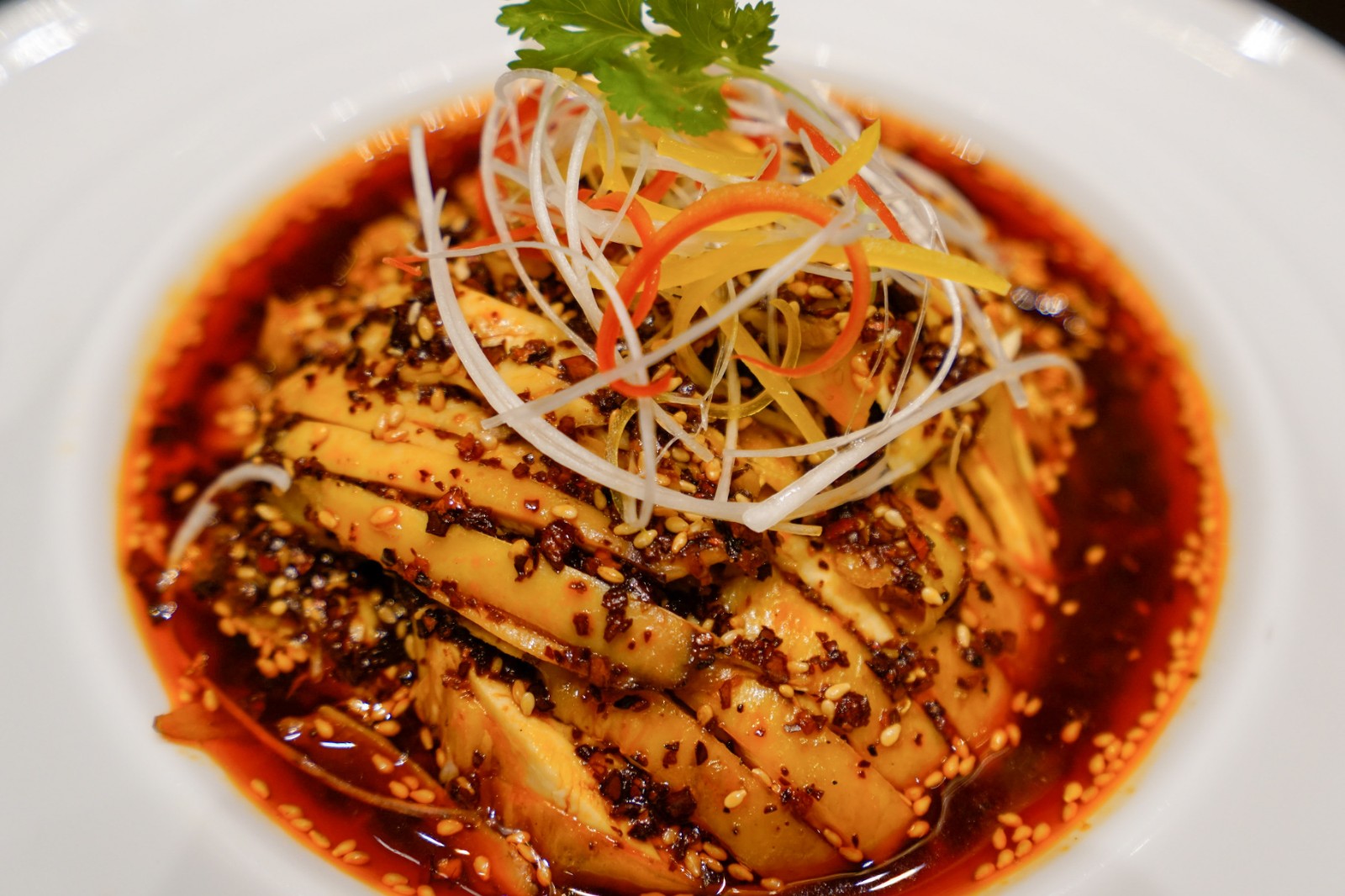 调汁,加入适量花生碎;鸡腿肉切成2cm的长条状摆盘,调汁淋入即可
