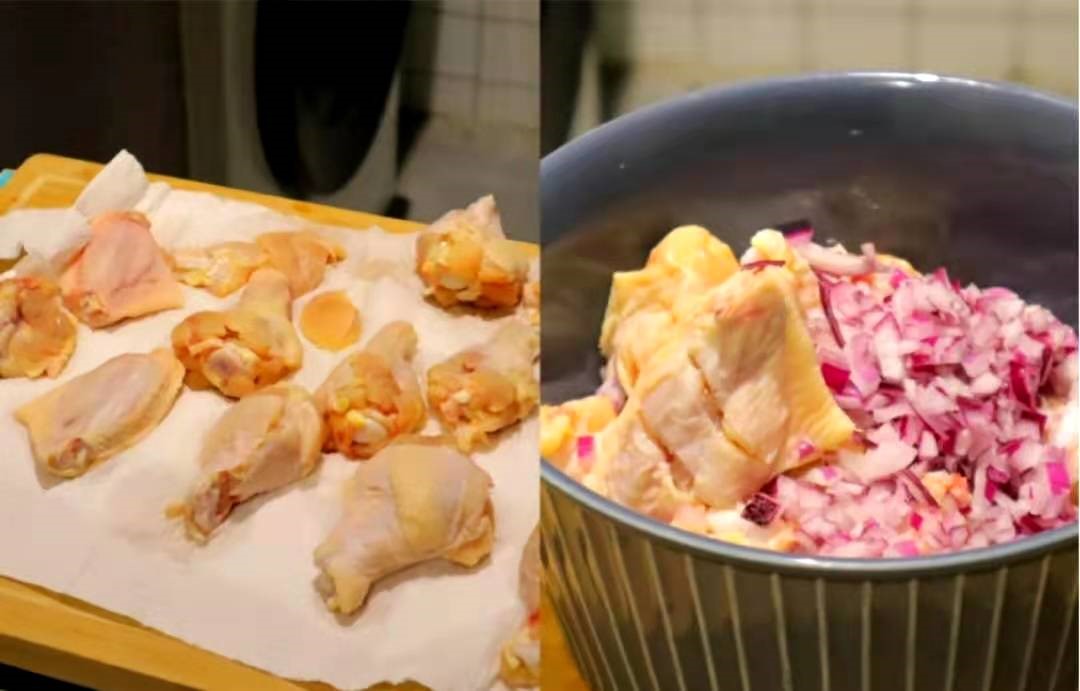 鸡翅根用厨房纸吸水,加入洋葱末,牛奶,一勺盐,一点胡椒粉,一点辣椒粉和匀,保鲜膜盖上腌制半小时以上。