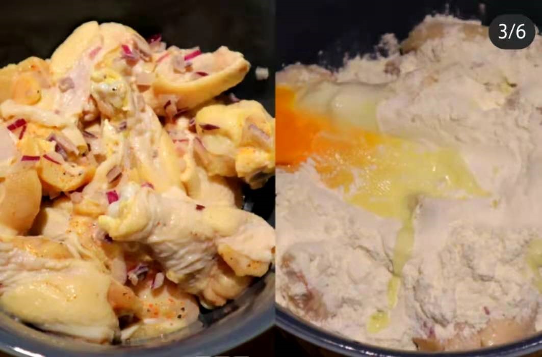 腌好的鸡翅根沥干牛奶,放入两大勺面粉,一个鸡蛋拌匀,表面裹上干面粉。