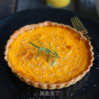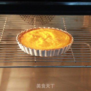 蒸熟的南瓜与馅料部分其他材料一起倒入料理机中充分打匀。派皮出炉后,将南瓜派馅用网筛过滤后倒入派盘中。