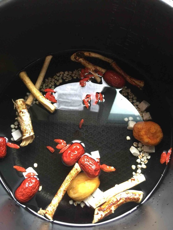 将薏米、五指毛桃、土茯苓、红枣、蜜枣和枸杞一起清洗后放进锅里