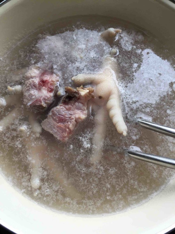 鸡爪和排骨冷水下锅,加热后焯水三分钟捞起洗净