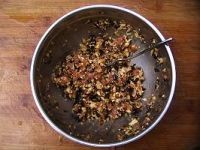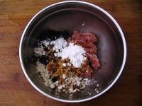 把香菇蓉木耳蓉瘦肉丁豆腐蓉一并倒入不锈钢盘中,加入油盐生抽淀粉;