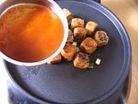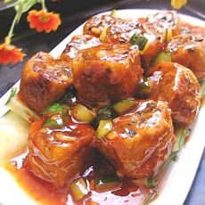 准备好甜面酱,加入生抽;加入少少盐,淀粉拌匀;再次预热电饼档,倒入少少油,加入青瓜丁;加入煎好的豆腐盒子;倒入调好的甜面酱;