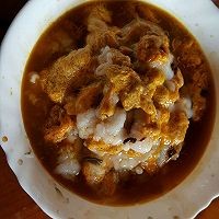 马蹄粉用水开匀,用另一个锅煮开,适合的芡汁后加入蟹黄煮匀