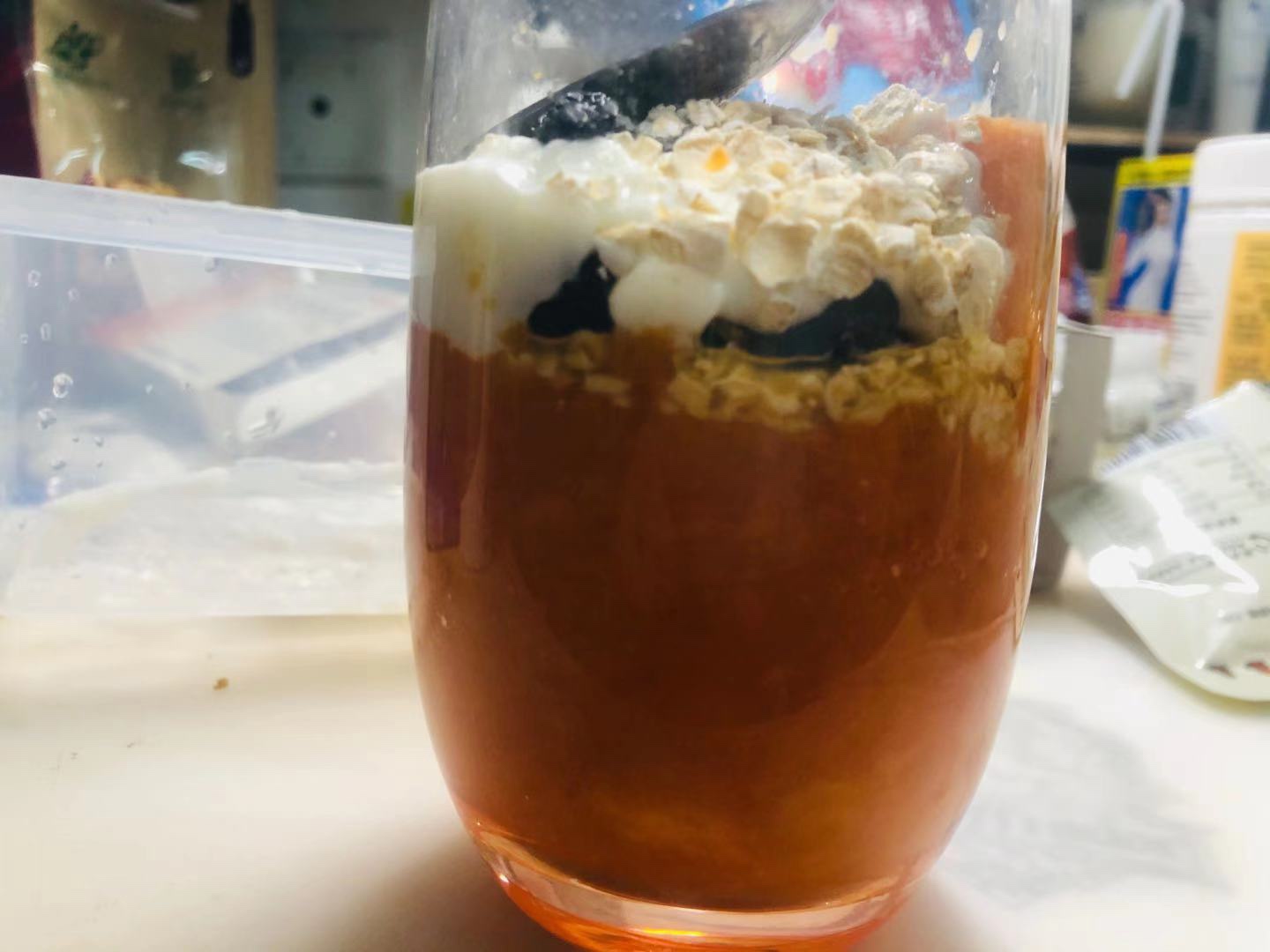 在杯子中一次加入木瓜泥、酸奶、麦片和坚果