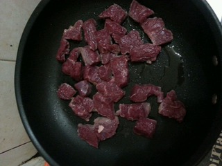 用不粘锅加一点点的油,把牛肉粒煎一煎