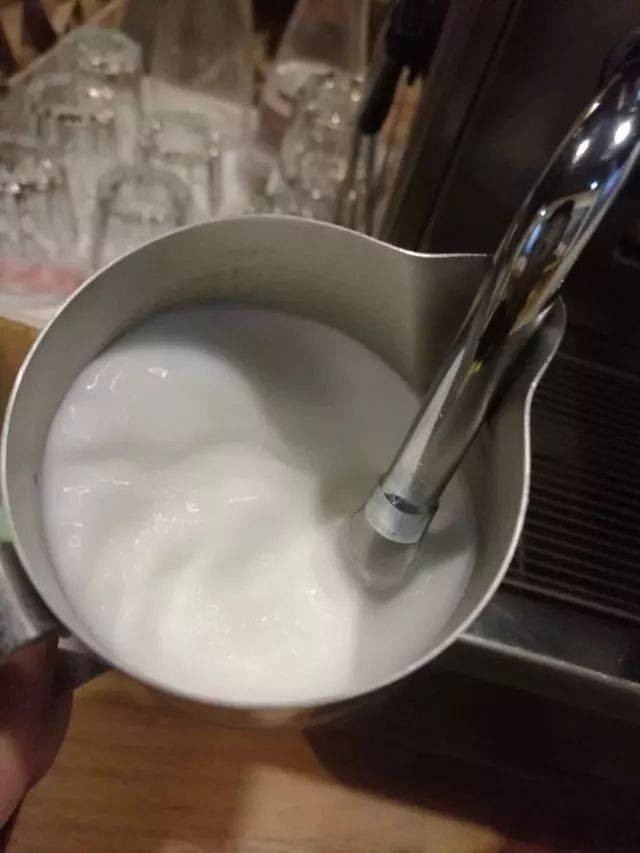 牛奶放入拉花杯中,加入适量水,打好奶泡