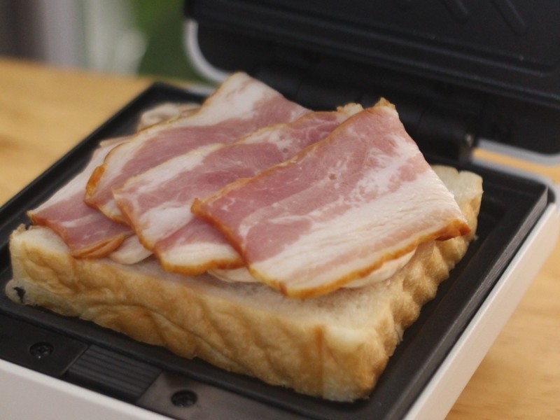 预热三明治机,抹上一点黄油,依次放上吐司片,蘑菇,西红柿,培根和包菜,洒上一点黑胡椒粉,再盖上吐司片