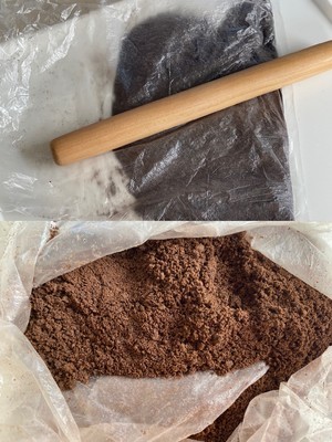 50g黄油隔热水融化和饼干碎搅拌均匀,倒入模具,用勺子压平(可以放入冰箱冷藏一会儿,等慕斯液做好了再拿出来)