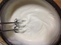 300g淡奶油加入35g砂糖开始打发。(淡奶油需要冷藏至少四小时以上才会容易打发,这一点一定要记住了)。奶油打至6-7分发就可以了,也就是从液体变成乳膏状,但是还可以缓慢流动,如果打至9分发就是裱花用的了,我们现在做的是慕斯,大过头了口感就变样了,如果真的一不小心大过头了,可以在加一点没有打发的淡奶油,搅拌一下,直到想要的效果,不过要注意称重,我们现在只需要300g。