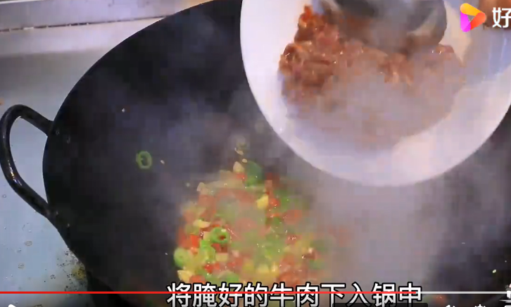 热锅冷油,加入大蒜生姜煸锅油炒香以后,牛肉下锅快速翻炒,肉变色以后盛起来,红尖椒、野山椒下锅,炒出香味以后,牛肉再下锅,一起快速翻炒