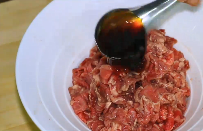 先把牛里脊肉用生抽、盐、鸡精、耗油腌制一会,牛肉通过腌制可以保存水分,这样炒起来的牛肉特别嫩