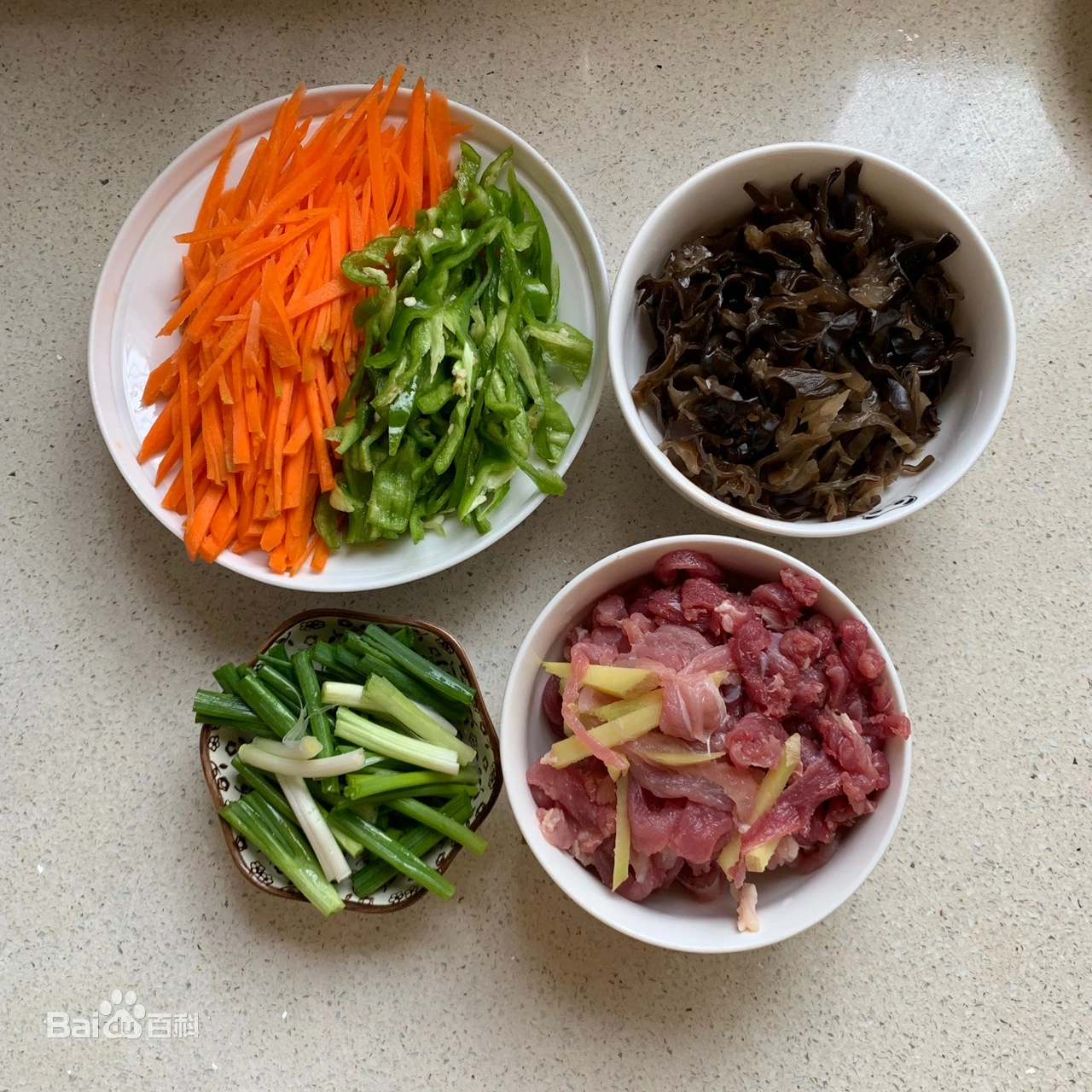 先把所有材料切丝,肉丝中放两个姜片,加料酒1勺、油1勺、淀粉1勺、盐1小勺,抓匀腌制片刻。