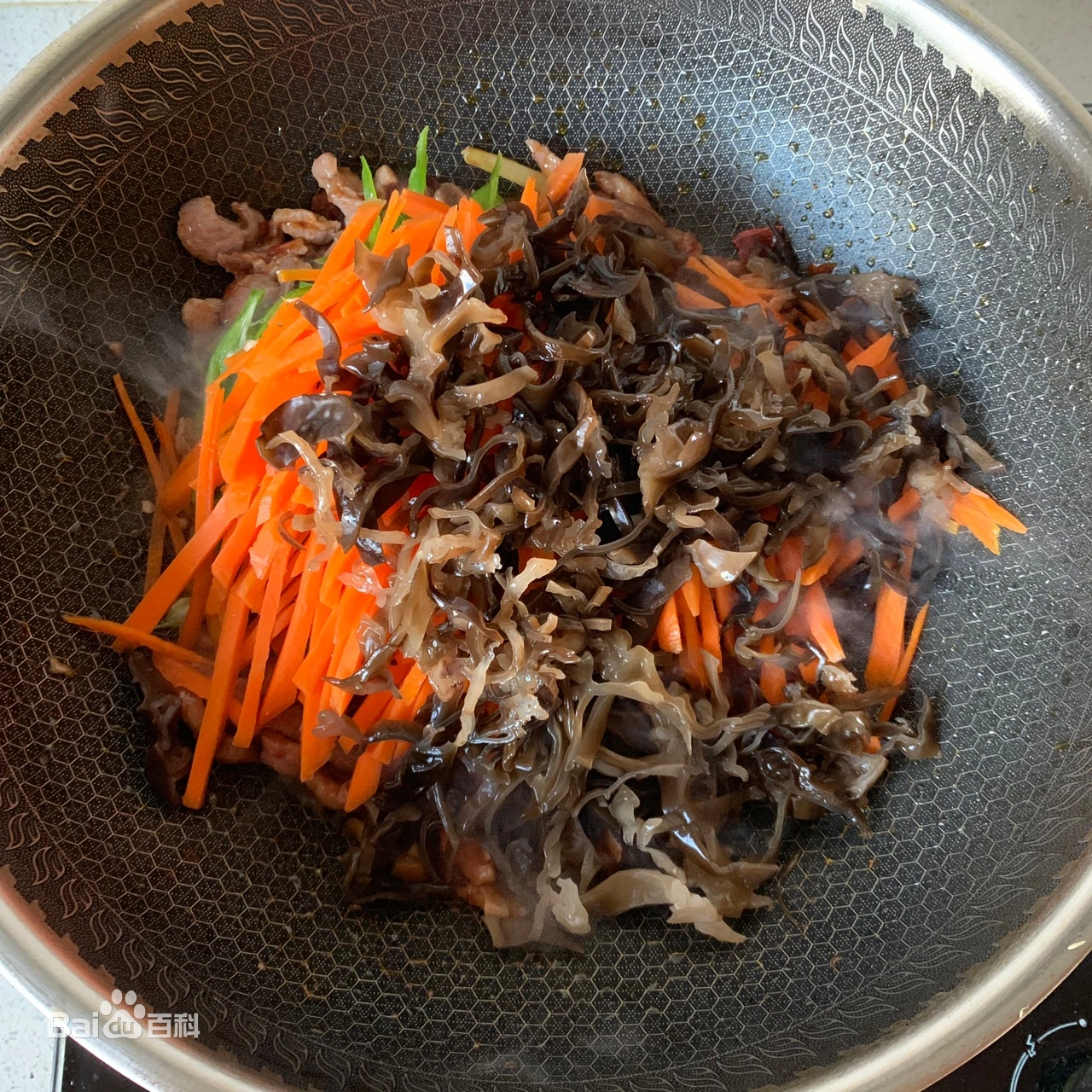 油热,下入肉丝煸炒至变色;放入1勺豆瓣酱炒匀;放入胡萝卜丝、木耳丝、青椒丝翻炒几下。