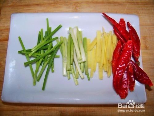 生姜切长条,大葱切段,新鲜青红椒切小块放入盘中备用