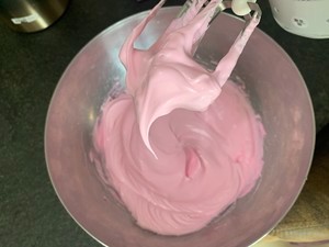 加入色素。中高档打发,到半干不湿的程度。比大弯勾硬一些。