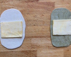 称好黄油,放入保鲜袋擀至1-2mm厚,放入冷冻室备用。松弛好的面团擀开到片状黄油面积的一倍大。放入冷冻好的黄油。