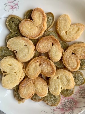 变硬后拿出。擀平,沿长度方向分成六分,最中间留一点点空隙。翻折手法如上,每折一次都要喷水撒砂糖。完成后的样子,送入冷冻室冷冻30min以上。