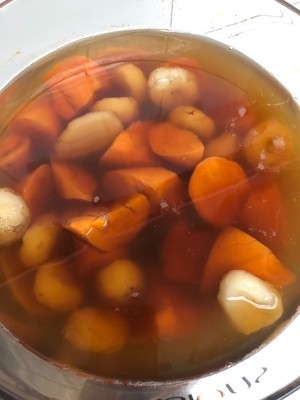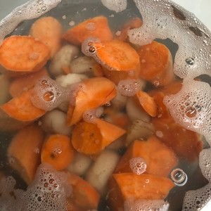 等水沸后加入红薯块,大火烧开后转中小火煲20-25分钟