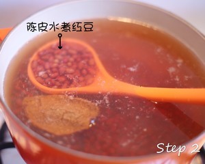 用陈皮水煮泡好的红豆,45分钟,直到红豆变软,皮爆开。