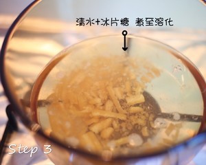 用另一个小锅煮冰片糖水,冰片糖敲碎比较容易溶化。把冰片糖煮溶,变成糖水。
