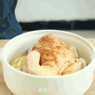 将鸡放入锅中,加入姜片、葱段、蒜瓣,倒入第1步准备好的香料水,腌制30分钟。