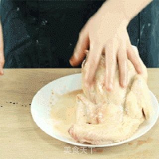 将鸡洗净,斩去头尾,分别用盐、米酒、生抽、白砂糖、老抽给鸡做个全身按摩。