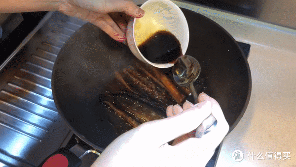 煎锅上倒少许油,放入鳗鱼块,大概煎5分钟后加入刚才的酱汁并和鳗鱼其平