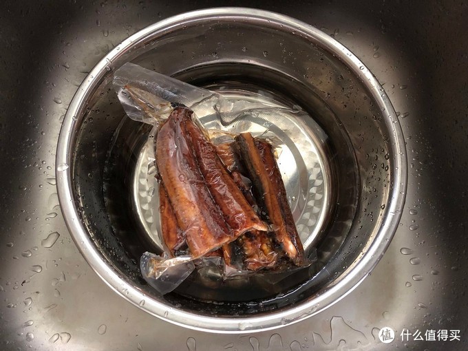 从冰箱里取出蒲烧鳗鱼并置水中解冻20分钟