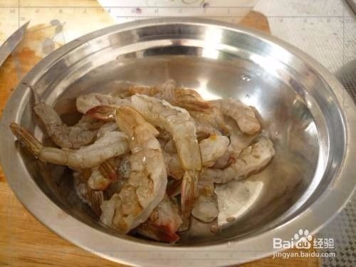 大虾洗净,开始加工,去掉虾头和尾巴以上的虾壳,清洗干净虾线。也就是剥出虾仁,留下虾尾巴。