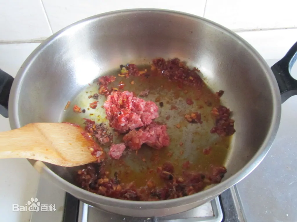 香味出来后放入牛肉馅料进去翻炒;牛肉馅料翻炒变色后加入料酒和生抽翻炒上色, 再加入适量的水。