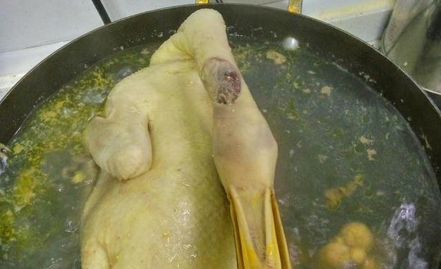 将鸭在开水中烫至皮缩紧,挂在风口处,擦去皮衣。