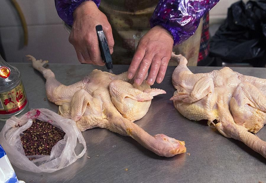 鸭子治净,用盐擦透鸭身,放缸中腌4小时,中间须翻动一次。
