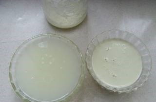 过滤的浆水倒入玻璃容器中,发酵12小时(冬季24小时,夏季12小时),经过沉淀,质地较浓即为生豆汁,最上层是浮沫和浆水;撇去浮沫和浆水,把生豆汁舀出。