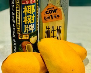 加入椰汁、牛奶、芒果粒、糖一起打成汁