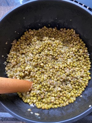 三十分钟后,豆已开花,想再烂些可压几下,想吃粒粒绿豆,可不压。