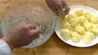 接着来做丸子:准备好萝卜丝,将鸡蛋打入碗内,撒上适量胡椒粉拌匀,再放入面粉,搅拌至萝卜丝变粘稠后,用手捏成4cm左右的丸子。