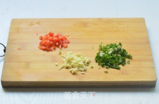 锅里热油,依次爆香蒜、红甜椒和葱。随后淋在皮蛋上