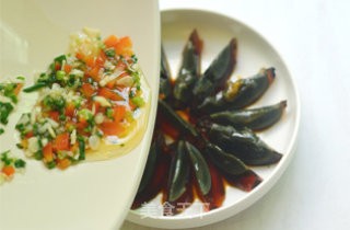 皮蛋洗净,剥去外壳,刀沾点水将其切成小块。淋上1汤匙生抽、1/2汤匙香醋、并撒上少许白糖