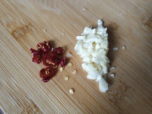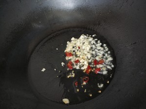 锅内加入适量的油烧热后,倒入蒜末、干辣椒炒香。