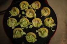 用竹签旋转90度,再加入一点面糊,加卷心菜,1-2分钟后