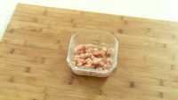 首先将鸡胸肉切丁 ,淋入料酒 ,放半勺盐, 拌匀, 腌5分钟 。放一勺生粉, 拌匀, 淋入油,继续 拌匀。