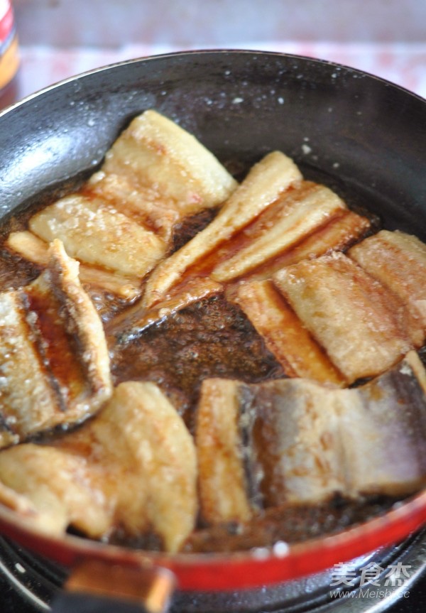 碗里倒入味淋、蜂蜜、生抽、老抽、糖和少许水搅匀。将鳗鱼表面拍一层淀粉。锅里倒入油,放入鳗鱼煎至两面金黄。这时候倒入酱汁,小火焖煮几分钟。