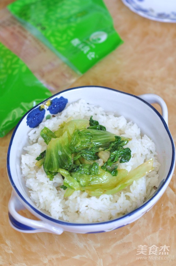 收汁后加入鸡精。炒锅里倒入油,将生菜炒软,出锅前加一点点盐。米饭焖好后,用铲子拌松散,盛入碗中,将炒软的生菜摆在上面。