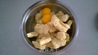 烫好的面团放在案板上晾凉。当温度不烫手后,放入一个鸡蛋