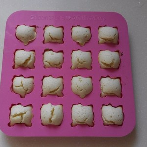 鸡蛋打入盆中,倒入砂糖,搅拌均匀,无需打发 倒入一点点色拉油,筛入低粉泡打粉牛奶炼乳,反正就是把剩下的材料都倒进去,搅拌均匀,成可以流动的面糊 拿硅胶模具(一定是合格的硅胶哦,不然进烤箱会化),把面糊倒进去。我是装进裱花袋里挤进去的。挤九分满,端起模具在桌上磕几下确保面糊都进去了。 烤箱170度,10分钟。看到面糊蓬起来,边缘有焦色,拿牙签戳进去,拿出来没有沾面糊就是好了。 取出,放凉,反过来自己就掉下里了。硅胶模非常好脱,完全不沾不沾不沾!想沾都沾不上我觉得连洗都不用洗了。