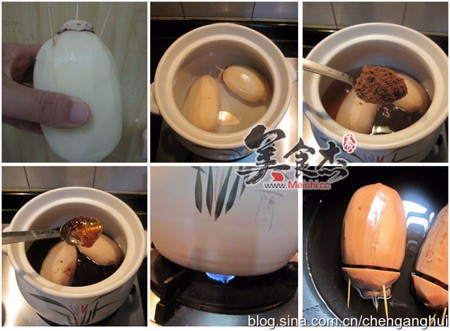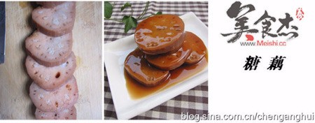 7.把藕盖合上,用牙签固定好 8.放入刚没过藕的水即可 9.待煮沸后放入红糖两大勺 10.麦芽糖两大勺、冰糖一大块 11.再次煮沸后改小火慢慢煮3小时(高压锅1小时即可) 12.煮好的糯米藕