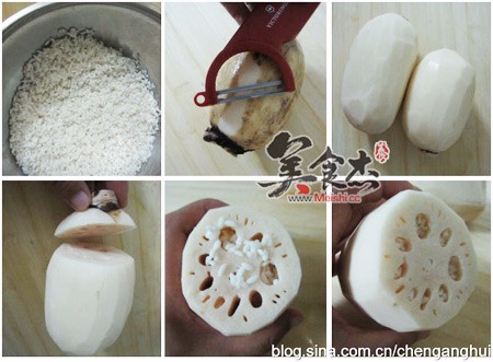 1.糯米提前浸泡2小时 2.藕洗净削皮 3.白嫩嫩的藕 4.用小刀在藕的六分之一处切开 5.塞入糯米,先铺上一层,用手轻拂,再在案板上跺一跺,还可以筷子帮忙 6.塞至8分满就好